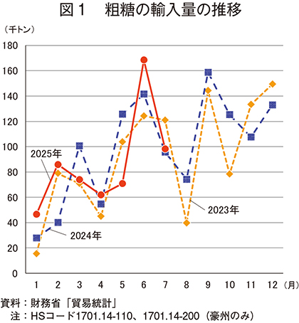 財務省「貿易統計」によると、2025年7月の甘しゃ糖・分みつ糖(HSコード 1701.14-110)および甘しゃ糖・その他(同1701.14-200の豪州)の輸入量は、9万8205トン(前年同月比2.7%増、前月比41.7%減)であった(図1)。