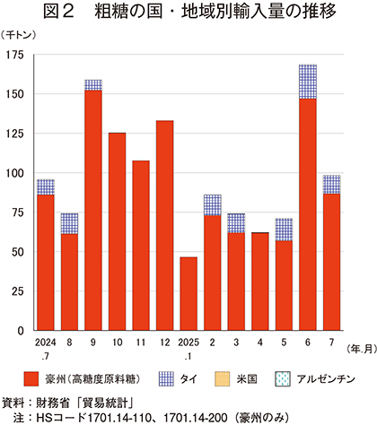 輸入先は甘しゃ糖・分みつ糖についてはタイ、甘しゃ糖・その他については豪州で、国・地域別の輸入量は次の通りであった(図2)。