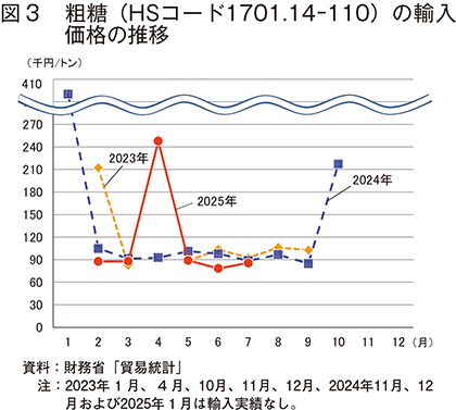 2025年7月における甘しゃ糖・分みつ糖の1トン当たりの輸入価格は8万5625円(前年同月比3.4%安、前月比9.4%高)(図3)であった。