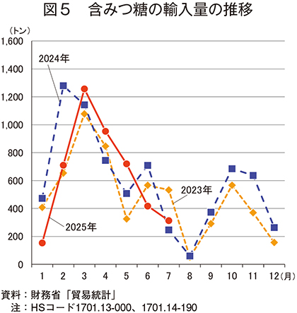 財務省「貿易統計」によると、2025年7月の含みつ糖(HSコード 1701.13-000、1701.14-190)の輸入量は、313トン(前年同月比26.7%増、前月比25.1%減)であった(図5)。