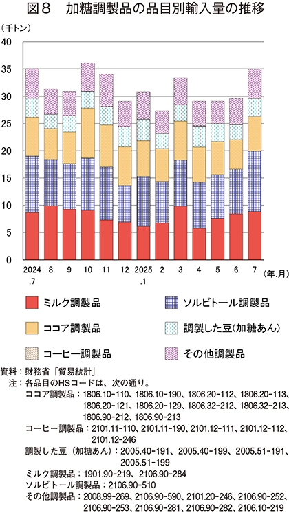 財務省「貿易統計」によると、2025年7月の加糖調製品の輸入量は、3万4951トン(前年同月比0.1%減、前月比18.1%増)であった(図8)。