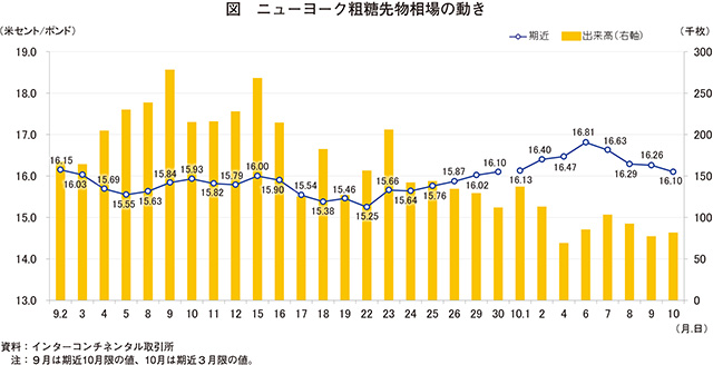 2025年9月のニューヨーク粗糖先物相場(10月限)の推移を見ると、2日はブラジルの増産見通しから1ポンド当たり16.15セント(注1)と前取引日から下落した。3日以降もブラジルの増産見通しから下落が続き、4日に7月上旬以来の15セント台となり、5日も続落して同15.55セントをつけた。8日以降は原油高(注2)により上昇傾向に転じ、10日は同15.93セントまで値を上げた。11日以降はインドの砂糖輸出増加見通しから下落したものの、15日はレアル高(注3)により同16.00セントまで値を戻した。16日以降はブラジルの増産による世界的な供給増から下落傾向に転じ、22日は同15.25セントまで下落した。23日以降は原油高とドル安により一転して上昇傾向となり、30日は同16.10セントで納会した。