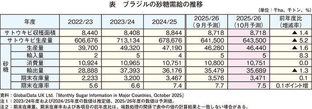 2025/26年度(4月〜翌3月)のサトウキビ収穫面積は、1〜3月の降水量が平均を下回ったことや圃場の更新により、872万ヘクタール(前年度比1.4%減)とわずかな減少が見込まれている(表)。サトウキビ生産量は、前年度の火災の影響のほか、年初からの干ばつ傾向に加え、6月と7月に中南部で局所的に発生した霜害などにより、単収が前年度を下回るとの見通しから、6億4350万トン(同5.2%減)とやや減少が見込まれている。