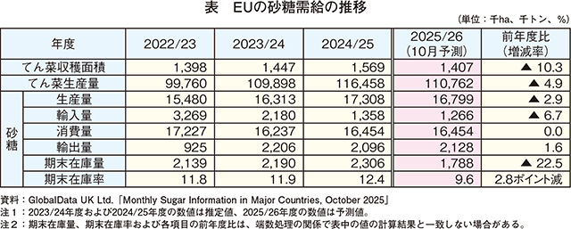 2025/26年度(10月〜翌9月)のてん菜収穫面積は、生産量上位国であるフランス、ドイツ、ポーランドを中心に各国で減少が見込まれることから、141万ヘクタール(前年度比10.3%減)とかなりの程度減少が見込まれている(表)。てん菜生産量は、フランスでは単収の向上、ドイツでは糖度の改善がそれぞれ見込まれているものの、作付面積の減少により、1億1076万トン(同4.9%減)とやや減少が見込まれている。