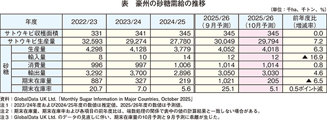 2025/26年度の砂糖生産量はかなりの程度、輸出量はやや増加する見込み