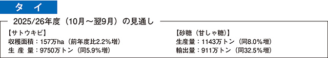 砂糖生産量は、サトウキビ増産により、1143万トン(同8.0%増)とかなりの程度増加が見込まれている。砂糖輸出量は、ブラジル産の輸出量減少が見込まれる中、砂糖の増産を背景に911万トン(同32.5%増)と大幅な増加が見込まれている。