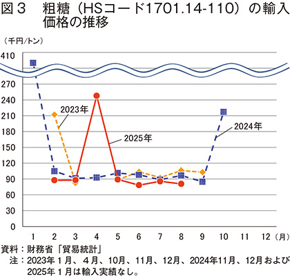 財務省「貿易統計」によると、2025年8月の含蜜糖(HSコード 1701.13-000、1701.14-190)の輸入量は、178トン(前年同月比3.0倍、前月比43.1%減)であった(図5)。