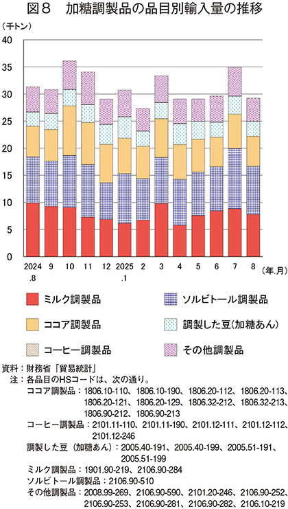 財務省「貿易統計」によると、2025年8月の加糖調製品の輸入量は、2万9234トン(前年同月比6.7%減、前月比16.4%減)であった(図8)。