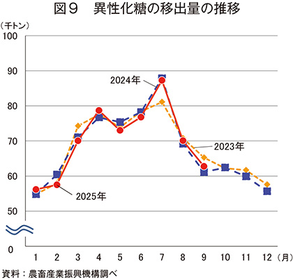 2025年9月の異性化糖の移出量は、6万2747トン(前年同月比2.7%増、前月比10.4%減)であった(図9)。