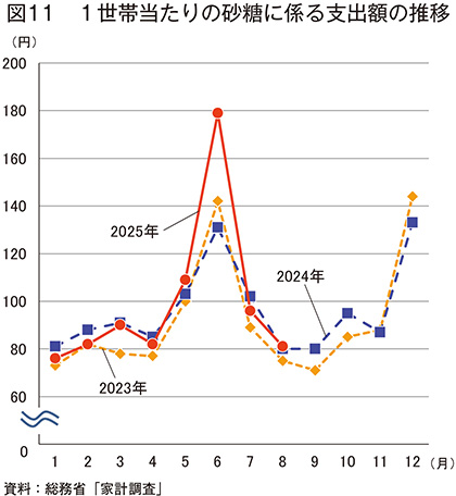 総務省「家計調査」によると、2025年8月における1世帯(二人以上)当たりの支出金額は81円(前年同月比1.3%高、前月比15.6%安)であった(図11)。また、同月の1世帯当たりの砂糖の購入数量は、256グラム(同4.8%減、同13.8%減)であった(図12)。