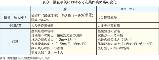 多畦収穫機の導入によるてん菜作業体系の変化は、主に以下の2点がある(表3)。第一に、カルチベータ(土壌の中耕や培土を行う農業機械)による中耕除草作業の省略である。十勝の事例においては、中耕作業によりてん菜周辺に土寄せがされることで、収穫作業が行いづらくなることが挙げられ、省略されていた。オホーツクの事例においては、