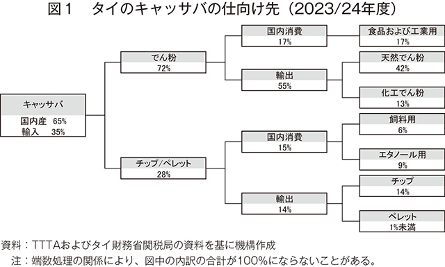 タイでのキャッサバの利用は多岐にわたり、キャッサバチップやペレットなどの一次加工品のほか、タピオカでん粉やエタノールなどの高付加価値商品の生産原料に用いられている。タイタピオカ貿易協会(TTTA)によると、2023/24年度(10月〜翌9月)は、国内で利用されるキャッサバの65%が国内産、35%が輸入品であり、このうちでん粉への仕向けは72%(前年度比15ポイント増)、チップ・ペレットは28%(同15ポイント減)であった(図1)。同年度は、キャッサバモザイクによるキャッサバ生産量の減少に加え、チップやペレットの主要輸出先である中国での政策変更により、中国国内での需要と輸入量が減少したことで、でん粉への仕向け割合増加につながった。