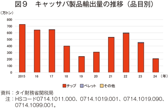直近ではCMDの被害拡大、長期的にはタイのキャッサバ産業進展により、将来的には同国内でのキャッサバが不足する可能性があるため、周辺国からのキャッサバ輸入を許可する政策の整備が求められるとしている。今後、同国のキャッサバ価格は、国内需給よりもキャッサバ製品の国際市場価格に左右されるとしており、国際競争力維持のため原料調達先の多様化が不可欠であると考えられる。