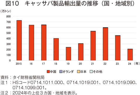 一方、タイのキャッサバ製品の輸出量は、中国の需要低下などを反映し、24年は209万トン(同54.1%減)と大幅に減少した(図9)。内訳はチップが206万トン(同53.8%減)、ペレットが3万トン(同69.2%減)であった。主要輸出先である中国向け輸出量は、207万トン(同54.0%減)と大幅に減少した(図10)。中国は飼料用途のほか、エタノール生産のためタイからチップを輸入していたが、近年はチップの代替として石炭やトウモロコシの利用を増やしており、24年のチップの輸入量は206万トン(同53.3%減)と大幅に減少した。