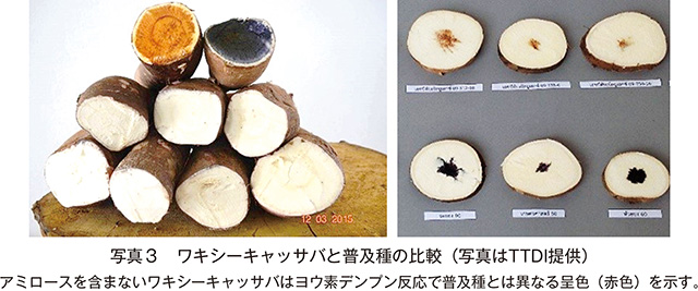 アミロースとアミロペクチンからなる一般的な天然でん粉に加えて、今日ではアミロースを含まないアミロペクチンのみからなる天然でん粉もある。アミロペクチンのみを有するでん粉原料作物は、コメやトウモロコシなどの一部の穀類、またはばれいしょやキャッサバなどのいも類に見られ、これらの品種はワキシー種と呼ばれることもある。一般的に天然でん粉は20%程度のアミロースと80%程度のアミロペクチンからなり、両者の組成比がでん粉の物性を左右するが、アミロペクチンの多いでん粉を食品に使用すれば、アミロースを多く含むでん粉に比べてその老化が抑えられることが知られている。キャッサバでは先行して遺伝子組み換え(GM)によるワキシーキャッサバが存在していたが、TTDIは世界で初めて商業的に非GMワキシーキャッサバの開発に成功した(写真2、3)。ワキシーキャッサバを使用したワキシータピオカでん粉は、一般的なタピオカでん粉に比べて