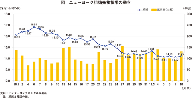 2025年10月のニューヨーク粗糖先物相場(3月限)の推移を見ると、1日は1ポンド当たり16.13セント(注1)とした後、2日以降はブラジルのサトウキビ糖度減少に起因する減産懸念から上昇し、6日は同16.81セントをつけた。7日以降は25/26年度の世界的な砂糖余剰予測により下落し、13日は原油安(注2)とレアル安(注3)により、同15.61セントとさらに値を下げた。14日以降はドル安などで一時的な反発があったものの、世界的な砂糖余剰予測に加え、26/27年度のブラジルの砂糖増産見通しから下落し、22日は同15.10セントをつけた。23日は原油高で上昇したが、24日以降は世界的な砂糖余剰予測により軟調となり、24日は同14.97セントと約4年7カ月ぶりとなる14セント台を記録し、31日は同14.43セントをつけた。