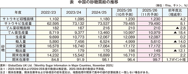 てん菜収穫面積は、前年度の記録的増加からやや落ち着きを見せ、21万ヘクタール(同2.8%減)とわずかな減少が見込まれている。てん菜生産量は、内モンゴル自治区での豪雨と降雪による収穫遅延が糖分低下につながる恐れがあることから、1098万トン(同18.4%減)と大幅な減少が見込まれている。