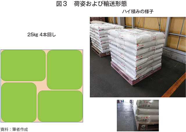 荷姿は、紙袋1本当たり25キログラム。第6回協議においては、1.1m×1.1mパレット(1.1パレット)に4本の紙袋を並べ、複数段積む輸送形態(4本回し、ハイ積み)とすることが決まりました(図3)。