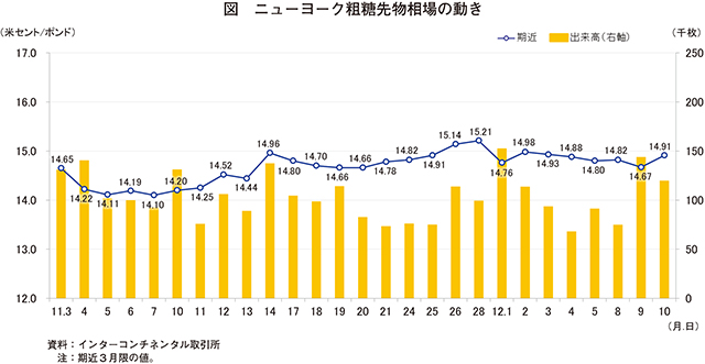2025年11月のニューヨーク粗糖先物相場(3月限の推移を見ると、3日はショートポジション(注1)をカバーするための買い戻しにより、1ポンド当たり14.65セント(注2)と前取引日から上昇した。4日以降は25/26年度のブラジル産およびインド産の増産見通しから下落に転じ、7日は同14.10セントをつけた。10日以降はレアル高(注3)やインド産の輸出減少見通しにより上昇傾向となり、14日は同14.96セントとなった。17日以降は世界的な砂糖余剰予測を受けて再び下落したが、21日以降はレアル高やインド産の輸出減少見通しにより上昇傾向となり、28日は同15.21セントとなった。