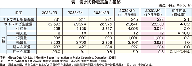 2025/26年度の砂糖生産量および輸出量はわずかな増加見込み