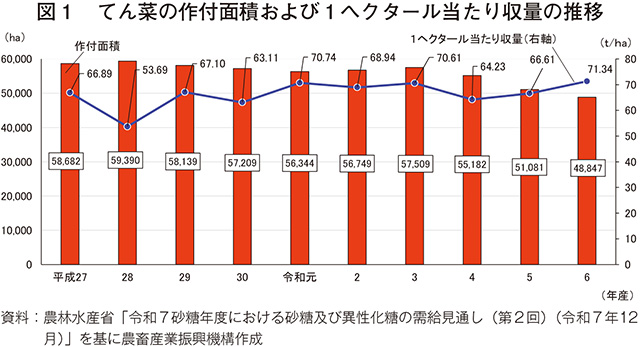 てん菜の作付面積は、生産者の高齢化や経営規模の拡大に伴う労働力不足などにより、減少傾向で推移している(図1)。令和6年産(令和6年10月〜翌9月)については、豆類や加工用ばれいしょなどへの作付け転換が進んだことから、前年産より2234ヘクタール減少し、4万8847ヘクタール(前年比4.4%減)となった。1ヘクタール当たりの収量については、生育期間中の気温が平年より高く、前年産に引き続き褐斑病の発生が確認されたものの、8月下旬から最低気温が平年並みとなったことや防除作業の徹底などにより、平年を上回る71.34トンであった。