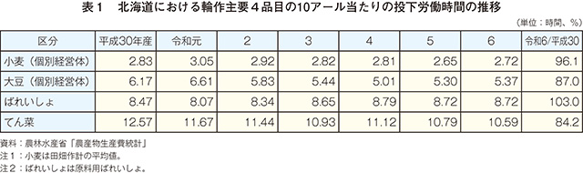 令和6年産における畑作の輪作体系における主要4品目(小麦、大豆、ばれいしょ、てん菜)の10アール当たりの労働時間は、てん菜が10.59時間、ばれいしょが8.72時間と、いわゆる「根物」で長い傾向にあり、労働負担の軽減が課題となっている(表1)。