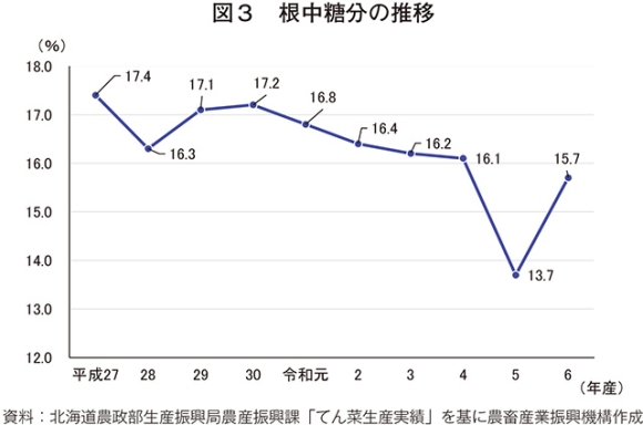 近年の生産量は、作付面積の減少に伴い、340万〜400万トン程度となっている(図2)。令和5年産は、褐斑病の多発に伴い平成28年産に次いで生産量が少なくなり、根中糖分については昭和61年の糖分取引開始以降最低の13.7%となった(図3)。6年産については、前述の防除作業の徹底などにより2ポイント増加し、15.7%となっている。