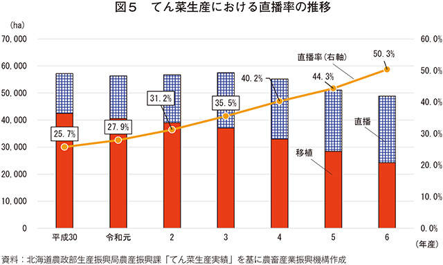 てん菜には、春先にハウスで育苗作業を行う移植栽培と、直接圃場に種子をまく直播栽培の二つの方法がある。近年は、育苗作業を必要とせず、労働時間の短縮が可能な直播栽培の割合(直播率)が全道的に増加している(図5、表2)。このように、てん菜栽培に係る労働時間の短縮が図られている一方で、依然として輪作主要4品目の中で労働時間は最も長く、生産者が作付けを敬遠しがちな要因の一つにもなっている。