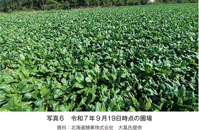 今回散布した圃場について、令和7年9月19日に状況を確認したところ、慣行散布圃場に比べて褐斑病の発生が若干見られたものの、収量および糖分に大きな影響を及ぼす発生にはならなかった(写真6)。