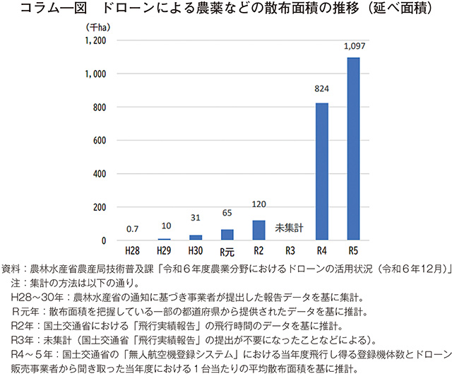 (コラム−注)ドローンで使用可能な農薬の登録状況や詳細については、農林水産省ホームページ「ドローンで使用可能な農薬」 (https://www.maff.go.jp/j/syouan/syokubo/gaicyu/g_kouku_zigyo/240117.html)および農林水産省「農薬登録情報提供システム」(https://pesticide.maff.go.jp/)をご参照ください。