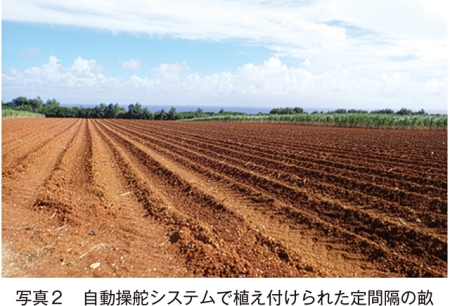 南大東島においては、自動操舵システムを搭載したトラクタがけん引するビレットプランタによる植え付けが、島内では毎年約2割の圃場で実施されている。