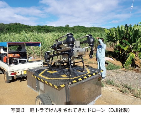 島内では、雑草の防除のほか、サトウキビの地下部の芽や成長点を食害するハリガネムシの防除策としてのフェロモンチューブ投下などに合計3台の農業用ドローンが使用されている。
