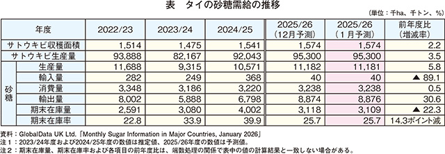砂糖生産量は、サトウキビの増産により、1118万トン(同5.8%増)とやや増加が見込まれている。しかし、年末年始にかけての製糖工場での圧搾処理の中止やカンボジアとの国境閉鎖に伴う労働力確保の問題などで収穫遅延が発生していることから、累計での生産量は前年度を下回って推移している。砂糖輸出量は、ブラジル産の輸出量減少が見込まれている中、砂糖の増産を背景に888万トン(同30.6%増)と大幅な増加が見込まれている。