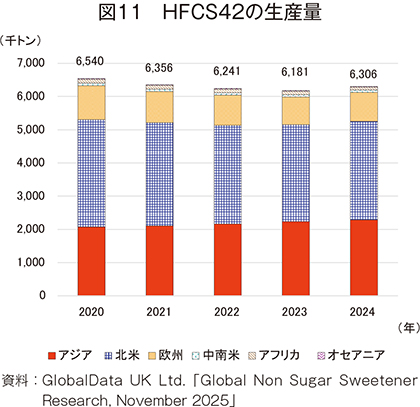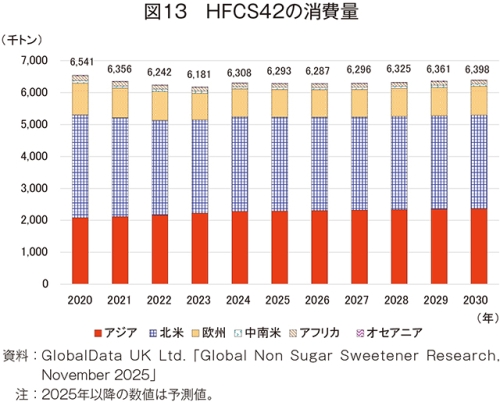 24年のHFCS42の消費量は、630万8000トン(20年比3.6%減)とやや減少した(図13)。30年には639万8000トン(24年比1.4%増)とわずかな増加が見込まれているが、20年比で見ると、2.2%減と長期的には減少が見込まれている。地域別では、米国の消費量減少により、最大の生産および消費地域である北米が292万7000トン(同1.1%減)とわずかな減少が見込まれている。これに対し、アジアは中国の堅調な需要により、236万8000トン(同3.7%増)とやや増加が見込まれているものの、20年から24年までの増加率と比較すると増加率は減少傾向にあり、消費の鈍化がうかがえる。