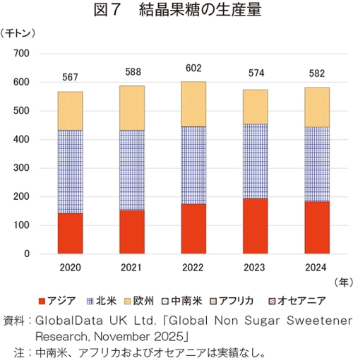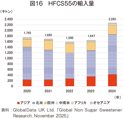 24年のHFCS42の輸入量は、49万5000トン(20年比23.3%減)と大幅に減少した(図15)。地域別では、アジア(同22.9%増)が唯一の増加となり、輸入量全体の6割以上を占める欧州(同24.2%減)、2割を占める北米(同14.7%減)は減少となった。その結果、輸入量全体も減少傾向となった。