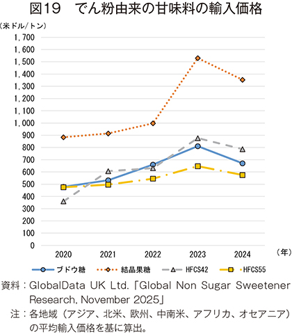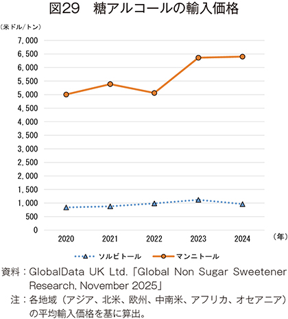 糖アルコールの輸出入価格は、2020年から24年まで両品目とも上昇傾向となった(図29、30)。
