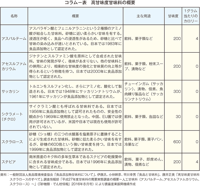 コラム 食品添加物としての高甘味度甘味料1 高甘味度甘味料の概要本稿で取り扱う甘味料の他にも世界にはさまざまな甘味料がある。本コラムでは、砂糖税の導入のほか、「ノンシュガー」、「シュガーレス」などをうたう商品(コラム注1)の増加を背景に注目が高まる高甘味度甘味料について取り扱う(コラム−表)。 高甘味度甘味料は、1グラム当たりの熱量が砂糖と同程度または0キロカロリーであるが、甘味度(コラム注2)の強さから砂糖よりも少量でより強い甘みを出すことが可能である1)。加えて、高甘味度甘味料は熱に安定的で水に溶けやすいため、ダイエット清涼飲料などの飲料や、ガムや錠菓などの菓子類で多用されている1)。砂糖などの代替甘味料として使用されるほか、食品に対する風味を増強するエンハンス効果や苦味などを抑えるマスキング効果を目的としての使用もある。なお、本文の図2で示した「でん粉由来の甘味料」、「その他の糖」および「糖アルコール」は、比較的砂糖に近い甘味度を有することから、低甘味度甘味料と呼ばれることもある。 (コラム注1)糖類に関する栄養強調表示の詳細については、『砂糖類・でん粉情報』(2025年10月号)「糖に関する表示について〜新たな食品表示基準の下で〜」<https://www.alic.go.jp/joho-s/joho07_003409.html>をご参照ください。 (コラム注2)砂糖の甘味を「1」とした時の甘味倍率。 ![]() 2 食品添加物としての高甘味度甘味料 高甘味度甘味料は、食品衛生法で規制されている食品添加物であり、他の食品添加物と同じように使用基準が定められている。日本では、消費者庁が食品添加物の安全性について食品安全委員会による評価を受け、人の健康を損なうおそれのない場合に限り、成分の規格や使用の基準を定めた上で使用を認めており、同様に海外でも国などによる安全性の確認が実施されている。そのため、サッカリンのように日本では食品添加物として使用が許可されている品目でも、中国や韓国では使用が許可されていないなど、国ごとに規制内容が異なる場合も多く、各国の状況については最新の情報を確認する必要がある。 また、世界保健機関(WHO)が23年5月に「非糖質系甘味料(NSS:non-sugar sweeteners)の使用に関するガイドライン(Use of non-sugar sweeteners:WHO guideline)」を公表し、「体重のコントロールやNCDsのリスクを減らすためにNSSを使用しないように」という提言がなされた。これに対して、消費者庁の食品衛生基準審議会添加物部会は、日本でのNSSの使用状況を踏まえ、日本では「NSSの各食品添加物の規格基準を改正する必要はないと考える4)」としている。さらに、有識者の中には、本ガイドラインは、「グレードの低いおよび極めて低い根拠に基づいて条件付きの助言をしている5)」ものであり、「日本は所得水準の高い先進国ではあるが欧米とは肥満や食環境は相当異なり、WHOガイドラインがあてはまらない状況がよくある5)」という声もある。こうした高甘味度甘味料を含むNSSについてのさまざまな議論は世界各地で巻き起こっており、引き続きその動向が注目される。 |