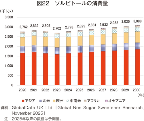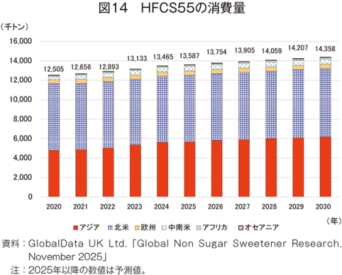 24年のHFCS55の消費量は、1346万5000トン(20年比7.7%増)とかなりの程度増加し、30年には1435万8000トン(24年比6.6%増)とかなりの程度増加が見込まれている(図14)。地域別では、欧州を除く全地域で増加見込みである。