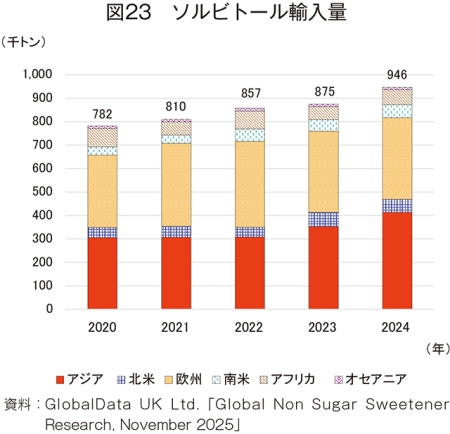 ソルビトールは、すべての地域で輸入価格が上昇し、輸出価格は北米を除くすべての地域で上昇した。特に、23年は欧州の輸出価格により急騰した。24年の輸出入価格が最も安い地域はアジアであった。
