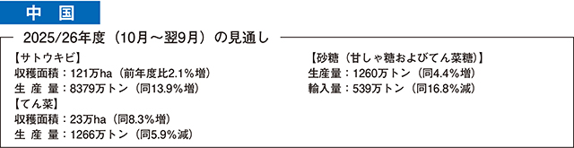 2025/26年度(10月〜翌9月)のサトウキビの収穫面積は、競合作物よりも収益性が高いことから生産者が作付けを増加させたことで、121万ヘクタール(前年度比2.1%増)とわずかな増加が見込まれている(表)。サトウキビ生産量は、主産地である広西チワン族自治区や雲南省での収穫開始が遅れたが、サトウキビの生育は良好であるため、8379万トン(同13.9%増)とかなり大きな増加が見込まれている。