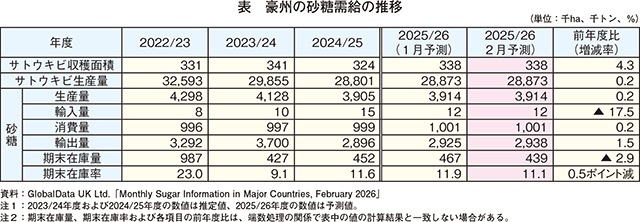 2025/26年度(4月〜翌3月)のサトウキビ収穫面積は、34万ヘクタール(前年度比4.3%増)とやや増加が見込まれている(表)。サトウキビ生産量は、23/24年度から継続して3000万トンを下回ることとなり、2887万トン(同0.2%増)と前年度並みが見込まれている。こうした中、豪州砂糖製造者協会(ASM)は、サトウキビ価格の下落で多くの製糖工場が赤字での経営を強いられており、砂糖業界にとって厳しい年となった旨の声明を発表した。26/27年度の作付けは、25/26年度の収穫作業が例年と比較して早期に終了したことで早期に開始され、初期の作況は好調と見られている。