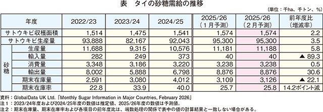砂糖生産量は、サトウキビの増産により、1119万トン(同5.8%増)とやや増加が見込まれている。しかし、年末年始にかけての製糖工場における圧搾作業の中止やカンボジアとの国境閉鎖に伴う労働力確保の問題などで収穫および圧搾作業に遅延が発生していることから、累計での生産量は前年度を下回って推移している。砂糖輸出量は、ブラジル産の輸出量減少が見込まれている中、砂糖の増産を背景に888万トン(同30.6%増)と大幅な増加が見込まれている。