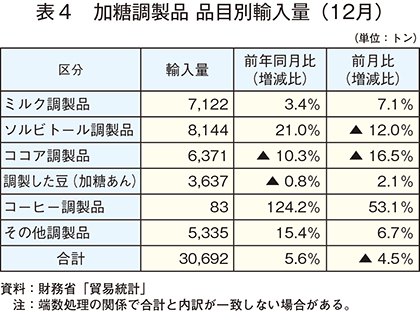 12月の加糖調製品の輸入量は前年同月からやや増加