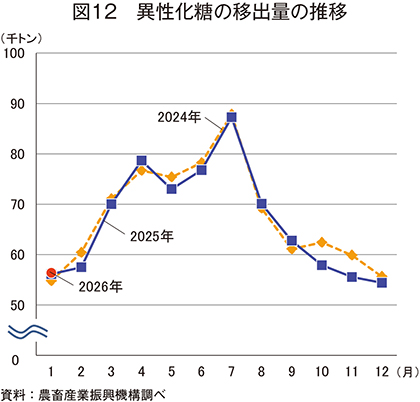 2026年1月の異性化糖の移出量は、5万6354トン(前年同月比0.4%増、前月比3.6%増)であった(図12)。