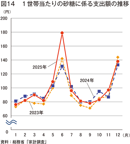 総務省「家計調査」によると、2025年12月における1世帯(二人以上)当たりの支出金額は138円(前年同月比3.8%高、前月比42.3%高)であった(図14)。また、同月の1世帯当たりの砂糖の購入数量は、430グラム(同4.9%増、同56.9%増)であった(図15)。