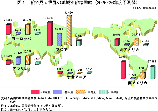 GlobalData UK Ltd.による2026年3月時点の予測によると(以下、特段の断りがない限り同予測に基づく記述)、2025/26砂糖年度(10月〜翌9月)の世界の砂糖生産量は、1億9391万トン(粗糖換算〈以下、特段の断りがない限り砂糖に関する数量は粗糖換算〉、前年度比2.4%増)とわずかな増加が見込まれている(表)。生産量第1位のブラジルは減産が見込まれている一方、同第2位のインドは増産が見込まれている。