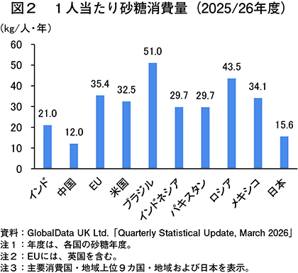 この結果、期末在庫率は前年度から0.9ポイント増加し、44.4%と見込まれている。地域別の砂糖需給の予測値は、図1の通りである。また、主要消費国・地域の1人当たり砂糖消費量は図2の通りである。
