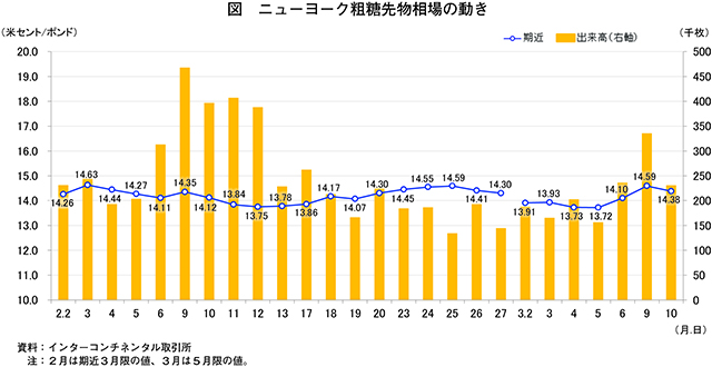 3月に入り期近が5月限に切り替わると、2日は原油高(注3)により5月限の値としては上昇し、同13.91セントとした。3日は原油高の影響が続き、小幅に上昇したものの、4日以降は世界的な砂糖余剰見通しにより下落し、5日は同13.72セントをつけた。6日以降は、イスラエルがイランの石油貯蔵施設を空爆したことによる原油高から、9日は同14.59セントと急騰したが、10日は原油安により同14.38セントと下落した。