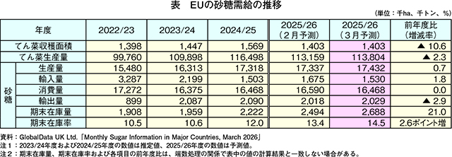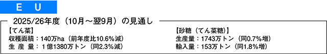 2025/26年度(10月〜翌9月)のてん菜収穫面積は、生産量上位国であるフランス、ドイツ、ポーランドを中心に各国で減少が見込まれることから、140万ヘクタール(前年度比10.6%減)とかなりの程度減少が見込まれている(表)。てん菜生産量は、作付面積の減少により、1億1380万トン(同2.3%減)とわずかな減少が見込まれている。