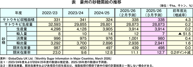 2025/26年度(4月〜翌3月)のサトウキビ収穫面積は、34万ヘクタール(前年度比4.3%増)とやや増加が見込まれている(表)。サトウキビ生産量は、23/24年度から継続して3000万トンを下回り、2887万トン(同0.2%増)と前年度並みが見込まれている。こうした中、豪州砂糖製造者協会(ASM)は、サトウキビ価格の下落で多くの製糖工場が赤字経営を強いられており、砂糖業界にとって厳しい年となった旨の声明を発表した。26/27年度の作付けは、25/26年度の収穫作業が例年と比較して早期に終了したことで開始が早まると見込まれている。